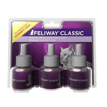 Aiuta i gatti a tenere il ritmo della vita moderna, consentendo un pieno appagamento ed evitando marcature urinarie, graffiature o tendenza a nascondersi. Feliway Classic è una copia del feromone facciale felino che i gatti depositano strofinando il loro muso sulle persone, mobili, porte e altri oggetti nella casa. È il segno che si sentono a loro agio e sicuri nell'ambiente in cui vivono. Feliway Classic utilizzato nell'ambiente in cui vive il gatto fornisce la stessa sensazione di sicurezza dei feromoni depositati dai gatti in natura.