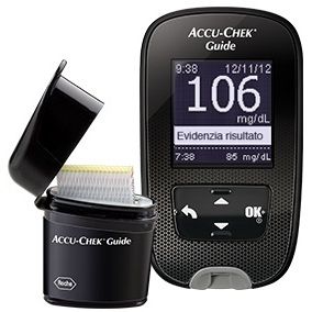 Descrizione Il misuratore Accu-Chek Guide semplifica l'esecuzione del test glicemico. Dispone di un flacone anti-rovesciamento che consente la rimozione di una striscia alla volta. L'illuminazione del vano d'inserimento della striscia facilita l'esecuzione del test anche al buio, l'ampia area di applicazione del campione e il pulsante di espulsione automatica della striscia agevolano la manualità in fase di applicazione della goccia di sangue e della successiva eliminazione della striscia usata. Piccoli particolari che aiutano a superare le difficoltà quotidiane legate alla misurazione glicemica.